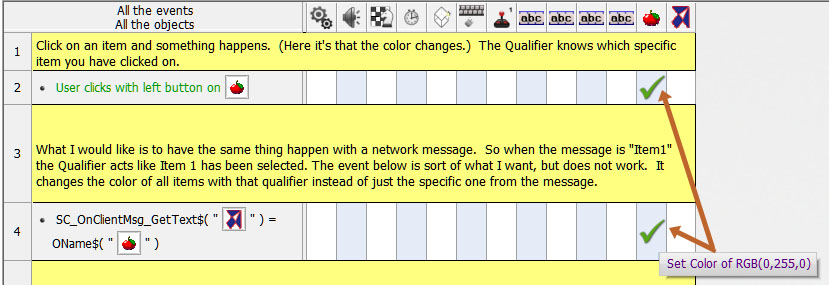 I have a bunch of String objects that are part of a qualifier group. I have an event set up so when I click on a String object in that qualifier group, it changes color (Fusion knows to change the color of only that specific String object). Is there a way to select with a network message instead of by clicking on the specific string object? I'm trying to avoid having to make a few hundred events-- one for each string object.