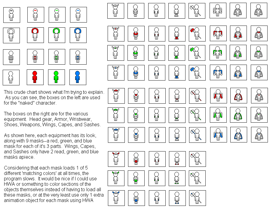 9 clothing types, each type needing up to 9 masks to recolor the equipment for a total of 10 object types per clothing type. Here is an image to reflect my explanation: