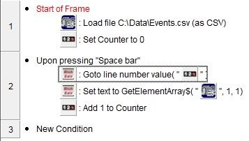 The intent is for game message strings to be retrieved from a CSV file array and then have them displayed (when triggered) in the Rich Edit Object using a counter-controlled line number.